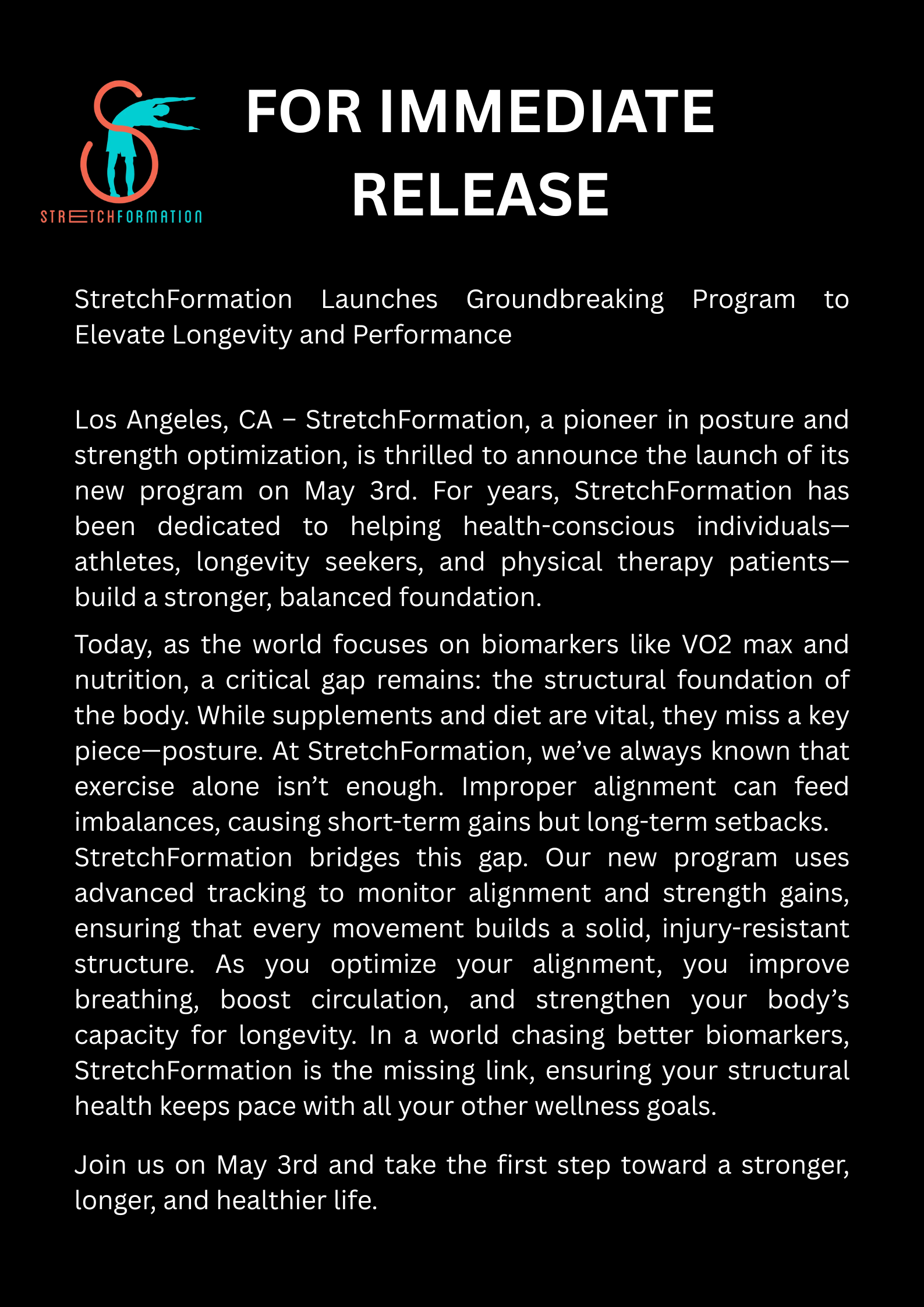 Los Angeles, CA – StretchFormation, a pioneer in posture and strength optimization, is thrilled to announce the launch of its new program on May 3rd. For years, StretchFormation has been dedicated to helping health-conscious individuals—athletes, longevity seekers, and physical therapy patients—build a stronger, balanced foundation.